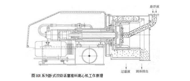 HR系列臥式雙級活塞離心機基本結構離心機主要由泵組合推料機構機座軸承組合轉鼓篩網機殼及電控箱等部件組成.