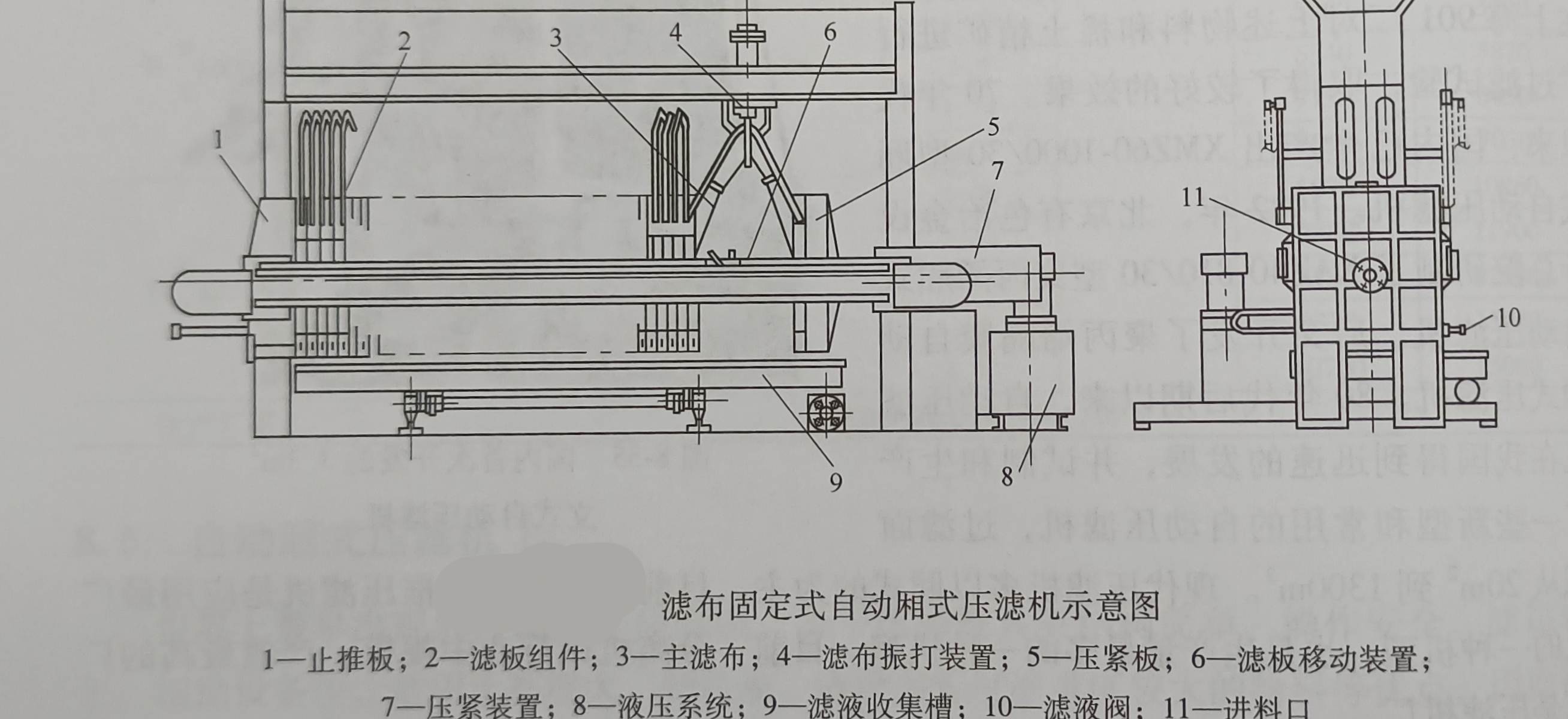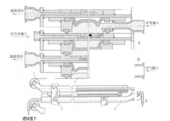 濾布固定式壓榨型自動廂式壓濾機濾板布置是采用廂式濾板與隔膜濾板交錯排列,工作原理與無隔膜壓榨型的大體相似.