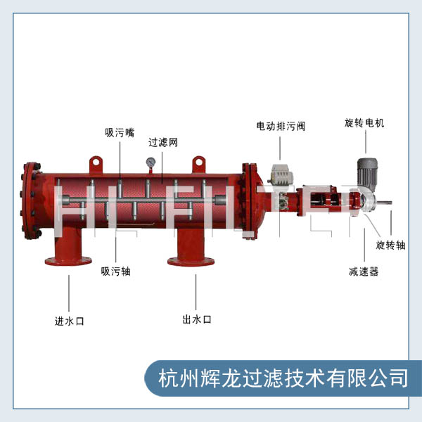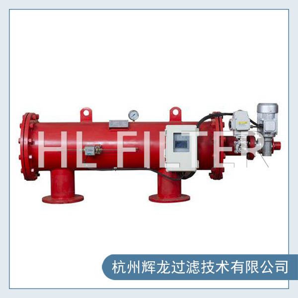 當水從進水口進入過濾器濾筒內部,雜質被攔截在過濾筒內壁,過濾后的干凈水從出水口流出,當濾筒內壁的雜質越積越多時,自清洗過濾器進出口的壓差達到預設值或達到清洗時間或手動預制時,將開始自清洗過程,整個包含兩個步驟:打開位于自清洗過濾器上的自動排污閥;電機帶動自清洗過濾器濾網內的清洗刷,被濾網所攔截下來的雜質從排污閥排出,清洗時系統不斷流,自清洗過濾器的整個運行過程由隨機配備的一個智能控制箱來控制。